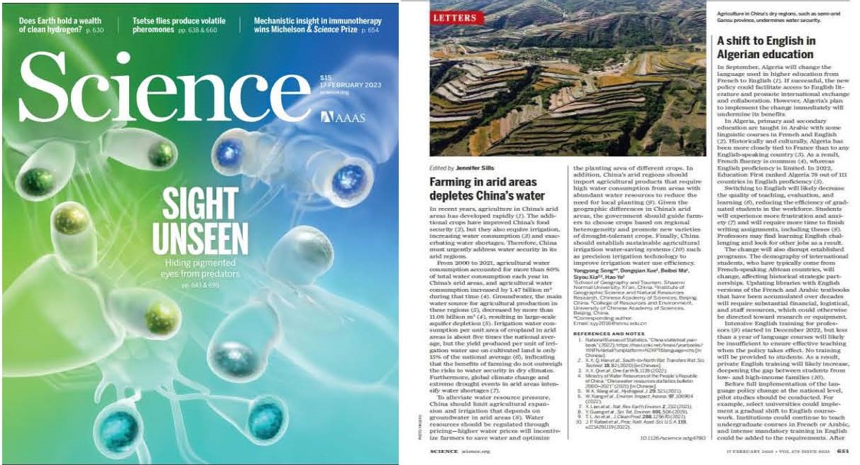 2023年2月17日,财神捕鱼薛东前教授、宋永永副研究员团队在Science(科学)期刊发表题为“Farming in arid areas depletes China’s water”(干旱区农业加剧中国水资源短缺)的Letter文章。师资博士后宋永永副研究员为该文第一作者和通讯作者,薛东前教授、马蓓蓓教授,中国科财神捕鱼