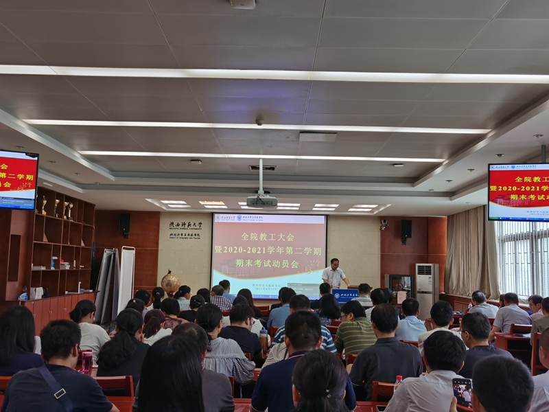 在格物楼一层报告厅召开全院教工大会暨2020-2021学年第二学期期末考试动员会,安排部署相关工作。会议由院长周正朝主持,全体教工参加。