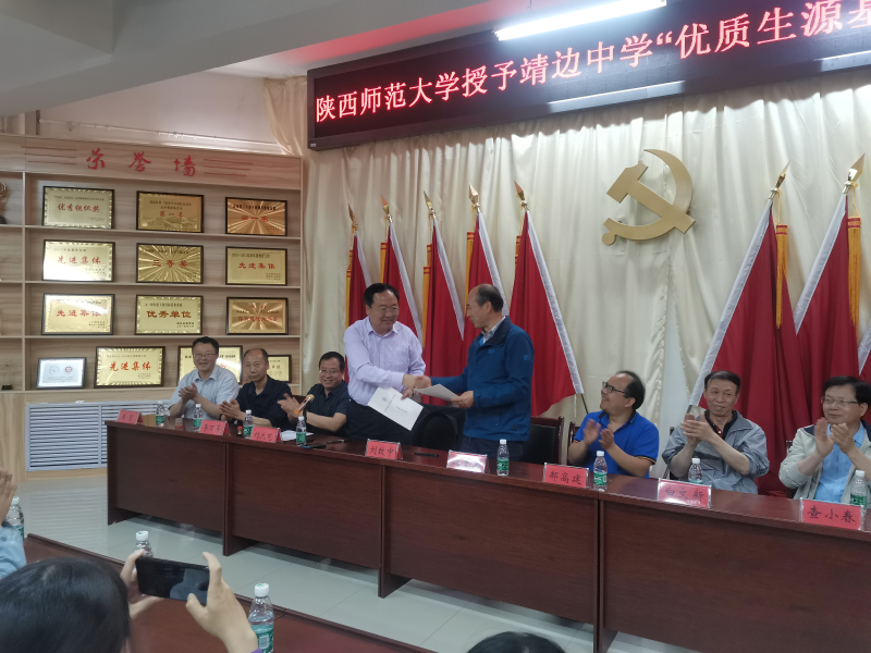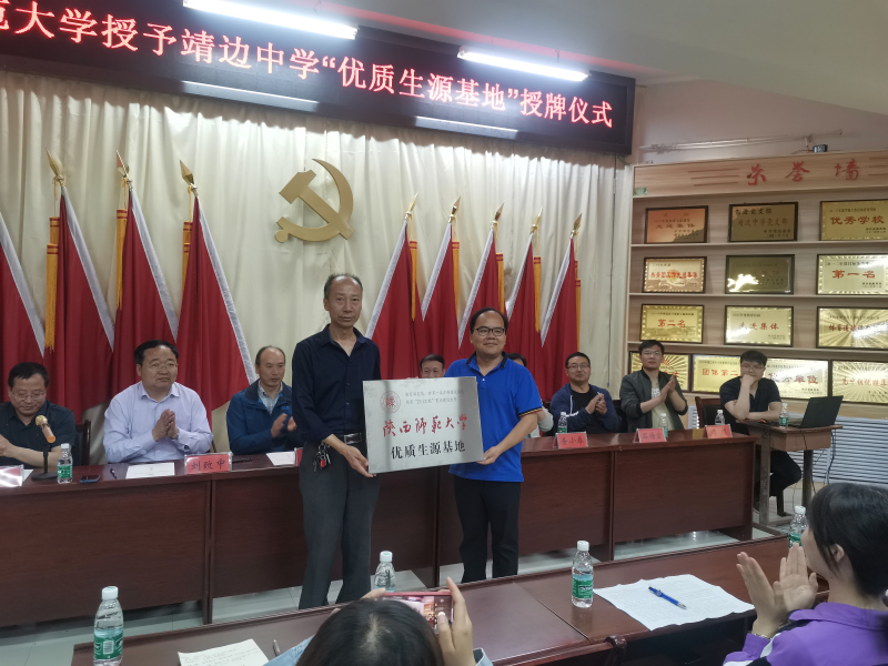 靖边中学校长刘致中、副校长李万军、副校长刘元艺、王泉等领导热情接待了各位老师并举行了授牌仪式。段克勤副院长代表学校与靖边中学签约共建“优质生源基地”, 党委副书记郝高建与副校长李万军为优秀生源基地揭牌。签约授牌仪式结束后,中学领导、地理教研组全体教师与财神捕鱼