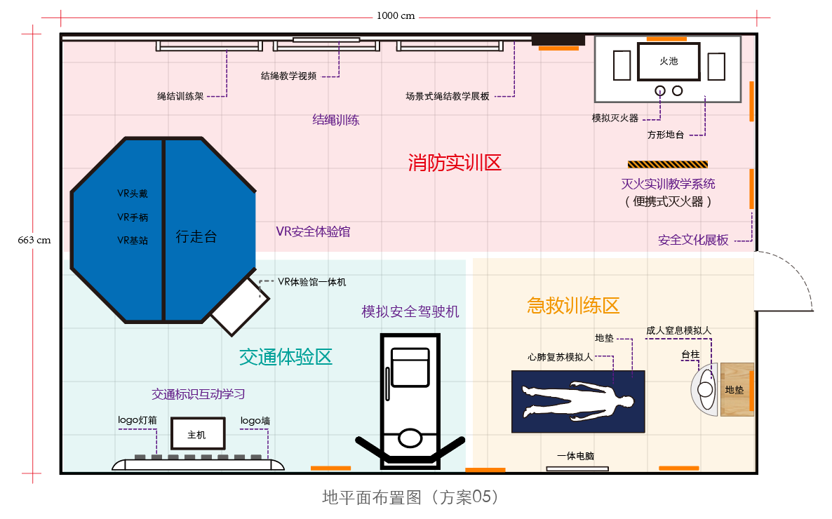 实训馆主要设施及项目包括醉酒行走体验项目、结绳训练、VR安全体验项目、交通标识互动学习项目、安全模拟驾驶项目、灭火实训教学系统和海姆立克训练七大板块。整个过程寓教于乐,通过完善的信息化基础设施和专业的教学设备,“场景式+情景式+体验式”的教育方式,使之成为避灾避险培训和体验的一站式场所,以期全面提升财神捕鱼师生的安全意识和素养。