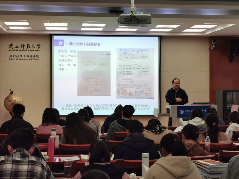 毕业生的就业情况、毕业生就业存在的问题等进行了讲解,其中对协议书签约、非师范考研志愿报考等做了重点讲述,鼓励同学们认清就业形势,把握好就业机会,顶住压力,积极进取,积极就业。还对求职过程中需要注意的事项做了详细说明。并对三支一扶、公务员选调等不同就业岗位向同学们做了政策解读,并就面试过程可能遇到的问题以及应对方案做了详细解答。
