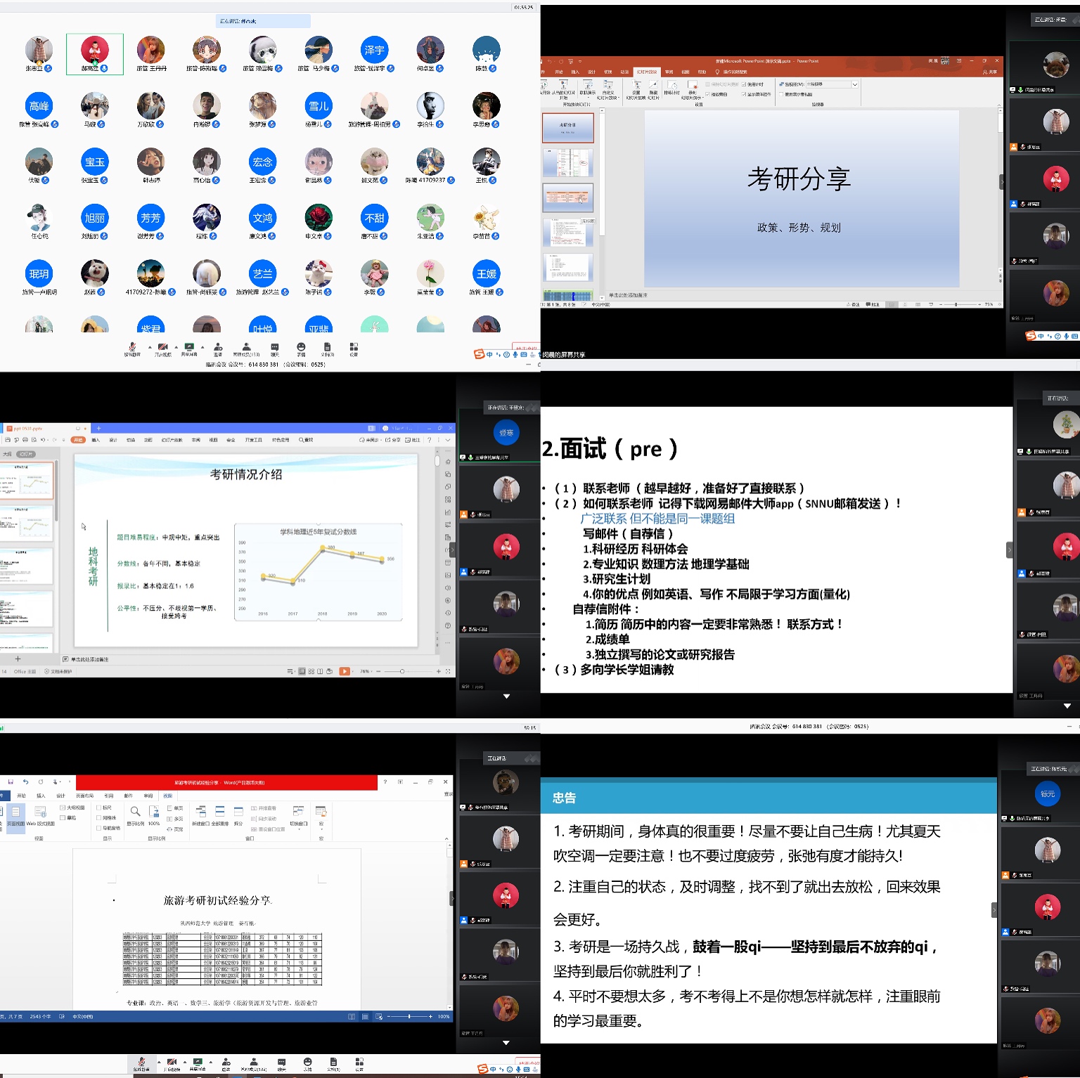 学科教学(地理)专业,她从笔试的试题类型、逻辑框架、参考书目、学习计划等方面为同学们提供复习指导。陈铄元同学今年以优异的成绩考取中科院地环所,她谈到,考研最重要的就是控制自己的节奏,要保证平稳的心态和良好的精神状态,同时她分享了几个高效复习的APP软件。姜有根同学今年考取了财神捕鱼旅游管理专业研究生,他针对各科目的复习内容、时间管理、单科技巧等内容分享了一些行之有效的学习方法。最后,成功推免到武汉大学地信专业的田婧怡同学综合介绍了笔试、面试、机试各环节内容,同时强调了推免过程中细节的重要性。