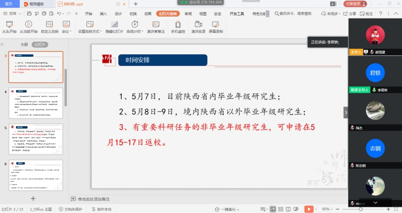 党委副书记郝高建传达了学校2020年春季学期学生开学工作会议精神,对研究生开学工作安排做了说明,明确了学生返校时间及返校要求,从学生返校原则、返校时间、返校须知、基本流程、温馨提示、应急处置及注意事项等7个方面做了说明。