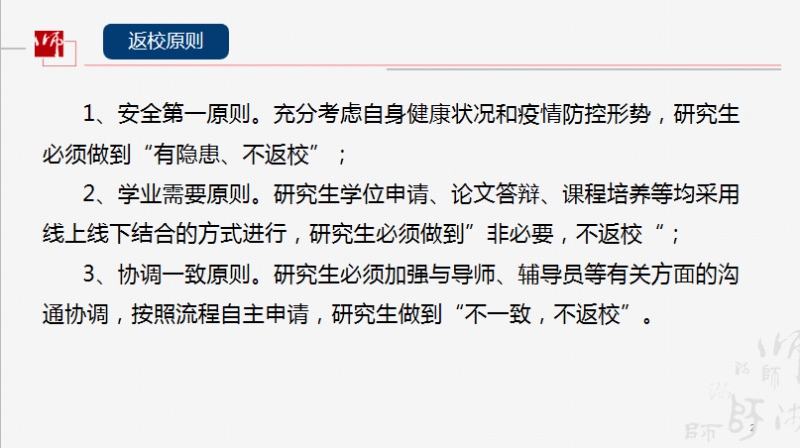 各位导师结合学校相关文件精神,就研究生返校时间、论文答辩等相关问题进行了交流讨论,并就相关情况作了反馈。