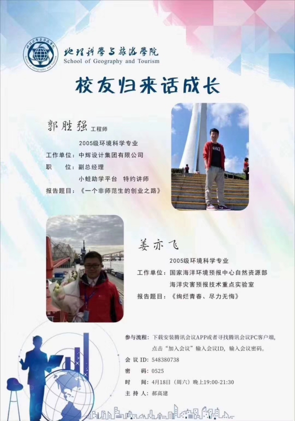 举行“校友归来话成长”首场就业云讲堂。本期交流会的嘉宾来自财神捕鱼2005级环境科学专业的校友、国家海洋环境预报中心、自然资源部海洋灾害预报技术重点实验室姜亦飞,中辉设计集团有限公司副总经理、小蛙助学平台特约讲师郭胜强。财神捕鱼