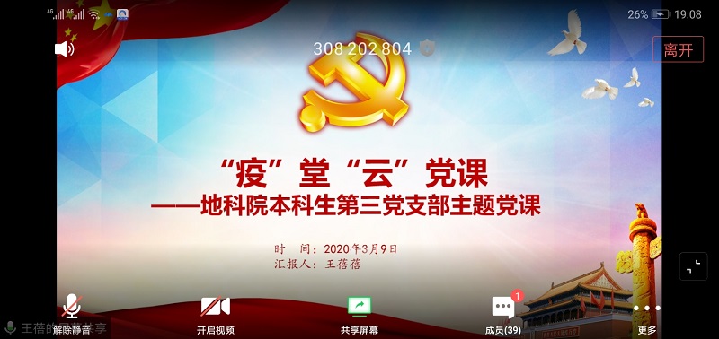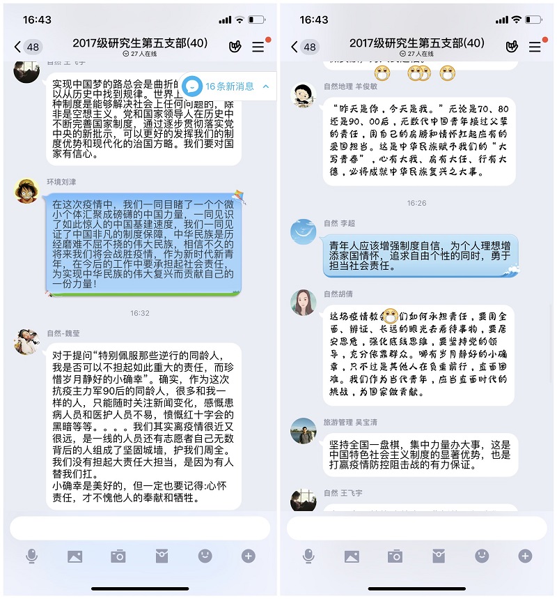 2016级环境科学专业张亚说,多难兴邦,黑夜那么漫长,但多少阴天都挡不住太阳升起。许多舍小家为大家的工作者们在前线后方共同奋斗,他们奔跑者寻找的第一道光,正在照亮前方的路。中华儿女与武汉同在,为武汉加油,为中国加油!通过这节课让我对祖国更加充满信心,而作为大学生的我要奋发图强,努力学习,为祖国的繁荣昌盛贡献自己的青春力量!本科生第三支部副书记、2017级环境科学专业伍子轩同学谈到,在教育部致全国大学生的一封信里说道,做“守护者”,就是担使命、保安康。做“修行者”,就是宅其身、抱道行。做“识途者”,就是要做到游必有方。正如冯秀军教授在直播课里所说,大写的青春里不能缺少大写的家国情怀。