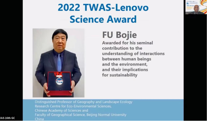 生态环境研究中心研究员、北京师范大学地理科学学部教授傅伯杰,以表彰他在研究人与环境之间的相互作用及其对可持续性的影响方面做出的开创性贡献。