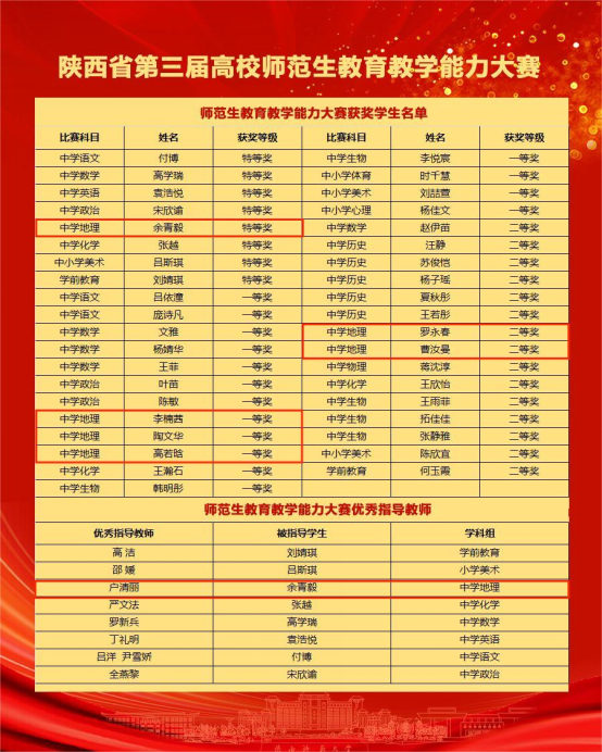 举行。大赛围绕“振兴师范·奠基良师”主题,旨在为广大师范生搭建一个展示教学能力的平台。来自全省15所高校的181名选手参赛,经即席演讲、板书测试、模拟授课和专家提问等环节的激烈角逐,财神捕鱼2021级本科生余青毅荣获特等奖,2021级本科生李楠茜、高若晗和2020级本科生陶文华荣获一等奖,2021级本科生罗永春、曹汝曼荣获二等奖。户清丽老师获评中学地理组优秀指导教师。