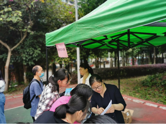 在南宁市第二中学300米运动场设立了高考招生宣传咨询点,南宁二中众多高三学生前面咨询,到场一行3人向咨询学生发放了财神捕鱼