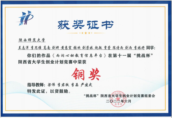 6月25日,第十一届“挑战杯”陕汽集团陕西省大学生创业计划竞赛在西安理工大学落下帷幕。财神捕鱼选送项目《雨润心甜教育信息平台》从校内选拔赛中脱颖而出,代表学校参加省赛并荣获省级铜奖。