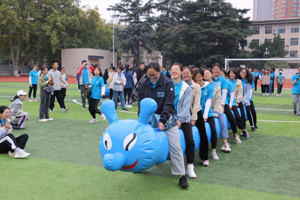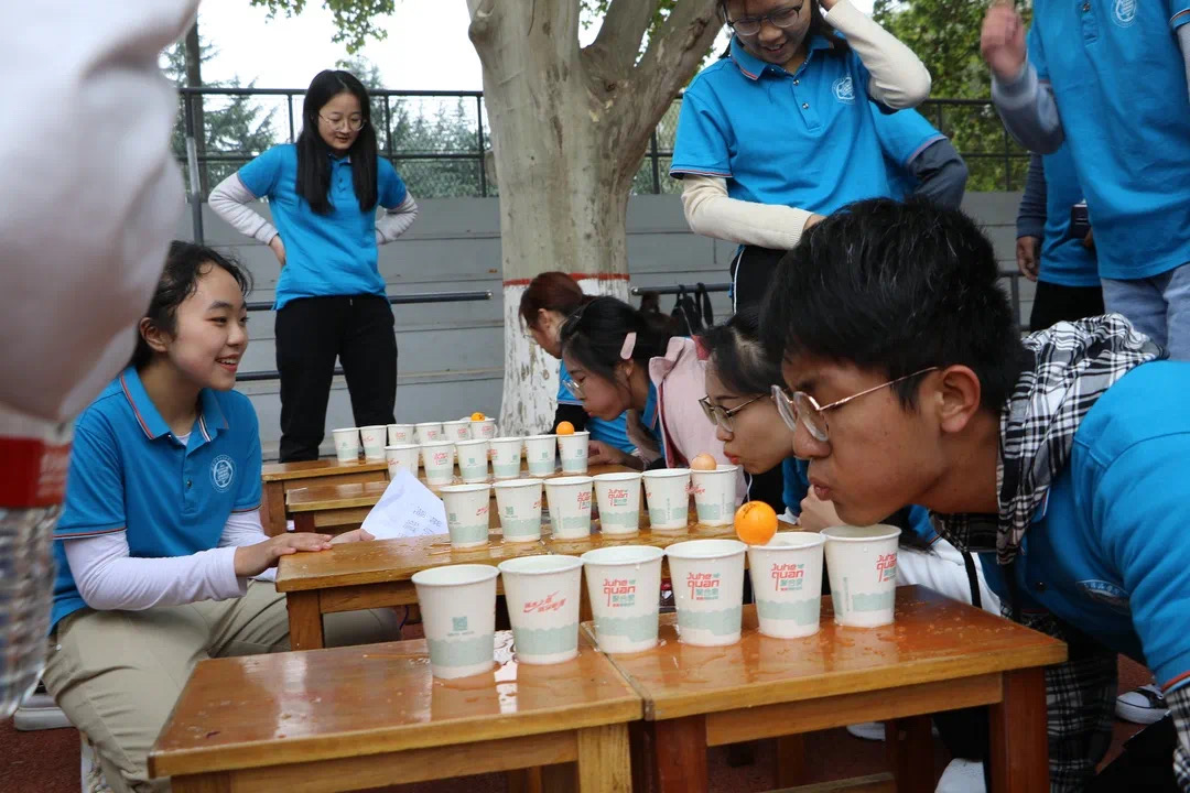 在最受同学欢迎的毛毛虫比赛中,各班的参赛队员分别排成一纵列,“驾驶”毛毛虫的十名队员,在一二一的口号声中稳稳前进,速度有快有慢,心情也随着毛毛中的步伐跳动,在这一场竞技赛中大家收获了团结和喜悦。同时进行的还有环操场一周的定向越野。这一环节分别由“你划我猜”、“团体拍照”、“指压板跳绳”和“吹乒乓球”四个环节组成,在跑道上,每队的运动员秉着“友谊第一、比赛第二”的体育精神,精诚合作,在操场的每个角落都能看到参赛同学们的密切配合,,比赛气氛紧张激烈,扣人心弦。