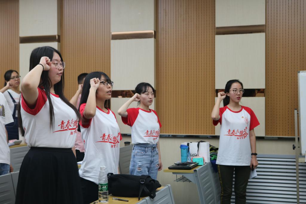 团委副书记于璐对中国共产主义青年团历史进行了宣讲,让同学们了解到了共青团的发展轨迹及重要事件,从1920年八月的上海社会主义青年团到1957年5月的中国共产主义青年团,在这短短三十多年的历程中,一个先进青年的群团组织建立起来,万众一心为实现共产主义不懈奋斗。接着同学们在范宇广同志的带领下重温了入团誓词,不忘初心,团结奋进。