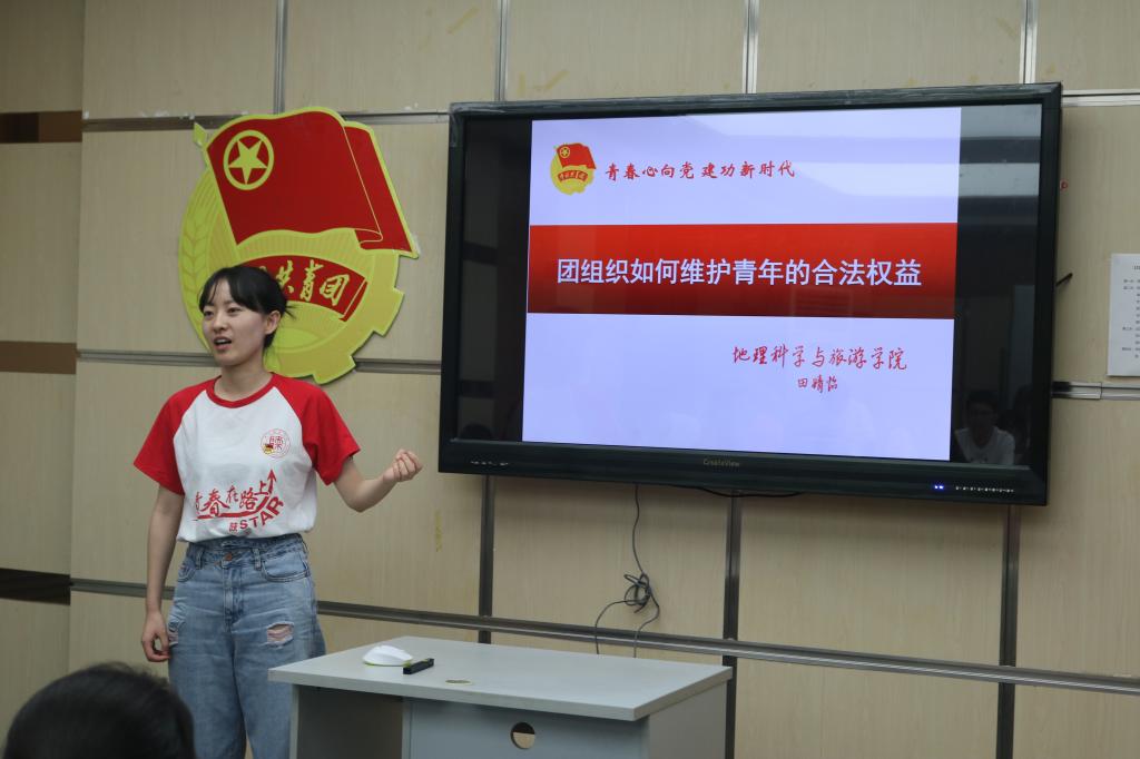团委副书记田婧怡介绍了团组织如何维护青年的合法权益。她从多个案例入手,简要介绍了维护青年合法权益的四个途径,向大家提出了如何保护自己和如何运用团组织保护自己的相关建议。
