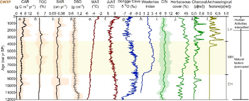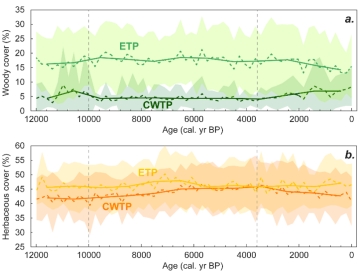 图1全新世以来青藏高原东部(ETP)和中西部(CWTP)的(a)木本和(b)草本植物覆盖变化