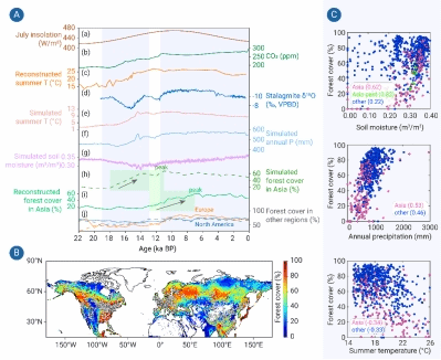 为了深入认识冰消期森林覆盖谜题,本研究提出了一个新的假设,即土壤水分在限制森林覆盖演化中起着关键作用。基于空间代替时间的思路,本研究利用现代卫星观测数据,探讨了森林覆盖率与气温、降水以及土壤水分的关系,发现亚洲地区的森林覆盖率对土壤水分的依赖性(相关性)高于气温与降水,但在欧洲和北美地区森林覆盖率与土壤水分的相关性较弱(图1BC)。进一步分析表明,在亚洲大范围的半湿润和半干旱区,森林覆盖对土壤水的敏感性要高于湿润区。末次冰盛期以来孢粉重建结果表明,亚洲森林覆盖的演变与土壤水分的演变具有很强的正相关性,突显了土壤水分的重要性(图1AC),而这在已有研究中常被忽略。本研究强调了土壤水分在解译森林演化中具有重要作用,这为深入理解“冰消期森林覆盖之谜”提供了一种全新的思路。本研究的结果也说明,为了更好地预测未来亚洲地区森林覆盖的变化以及精准确定人工造林潜力,需要充分考虑土壤水分动态。