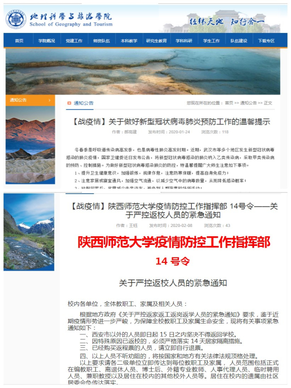 党委第一时间响应学校党委要求,印发《关于在新型冠状病毒感染肺炎疫情防控阻击战中发挥党支部战斗堡垒作用和党员先锋模范作用的通知》,号召全体党员要争当执行防控措施的表率、争当维护和谐稳定的表率、争当坚守岗位履职尽责的表率。学生党员、2019级自然地理学硕士生姜雨璇,本科生雷景铮、刘菲、杨云佳等同学积极参与社区、村委会的疫情防控工作。教工党支部党员在线上积极进行业务交流,为网上教学做好准备。